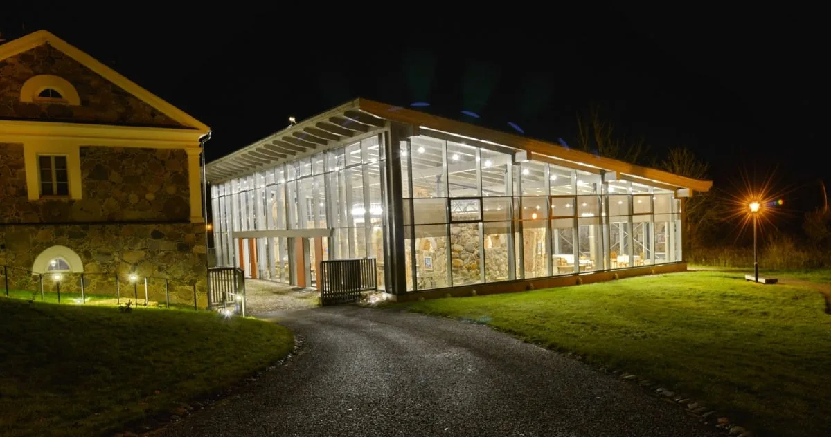 Jai skirta ne pokylių menė ir ne kokia nors grakšti pavėsinė, o arklidės! Arklidžių išlikęs tik fragmentas, turintis istorinę vertę ir saugotinas. Užuot atstatę pagal istorikų prielaidas visą architektūros paminklą, dabartiniai dvarininkai apgaubė originalią likusią sieną nauju moderniu statiniu – koncertų sale. Esu girdėjusi anksčiau apie tokį paveldo konservavimo būdą ir palieku diskusijas apie jį architektūros, archeologijos ir istorijos profesionalams. Mano akiai tokia šiuolaikybė klasicistinio dvaro ansamblio visumoje pasirodė svetinga, jauki ir nuteikianti gerai muzikinei patirčiai. Iš vidaus ji atrodo dar patrauklesnė, nes pro stiklo sienas atsiveria žavus kraštovaizdis. Bet tikrasis įspūdis išryškėja tik pasklidus garsui…