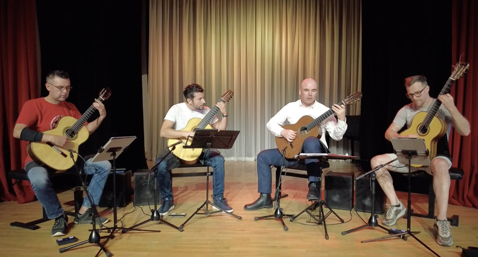 Kolektyvas, vertinamas vietinių klasikinės muzikos gerbėjų ir užsienyje pristatomas kaip lyderiaujantis gitarų ansamblis Baltijos šalyse, gimė prieš dvidešimt metų keturiems Lietuvos muzikos ir teatro akademijos studentams susibūrus į kvartetą. Po penkerių metų prie jų prisijungė gitaristas iš Belgijos. Per dvidešimt metų muzikinės kelionės sukauptas originalus repertuaras atsispindės ir koncerto programoje, įskaitant pirmąjį ir naujausią kvartetui parašytą Chriso Ruebenso kūrinį bei specialiai šiai progai sukurtą Mindaugo Stumbro kūrinį kvartetui. Programoje taip pat skambės kūriniai iš senesnių kvarteto albumų „Dancing with Guitar“, „Tradicion nuevo“ bei naujausio albumo „Pievų taku“. Dauguma kūrinių, labai įvairių stilių, įvairių grojimo technikų ir skambesių puokštė, arba originaliai parašyti kvartetui, arba yra jų pačių aranžuotės, kurių neatlieka niekas kitas pasaulyje. Tad klausyti nebus nuobodu!
