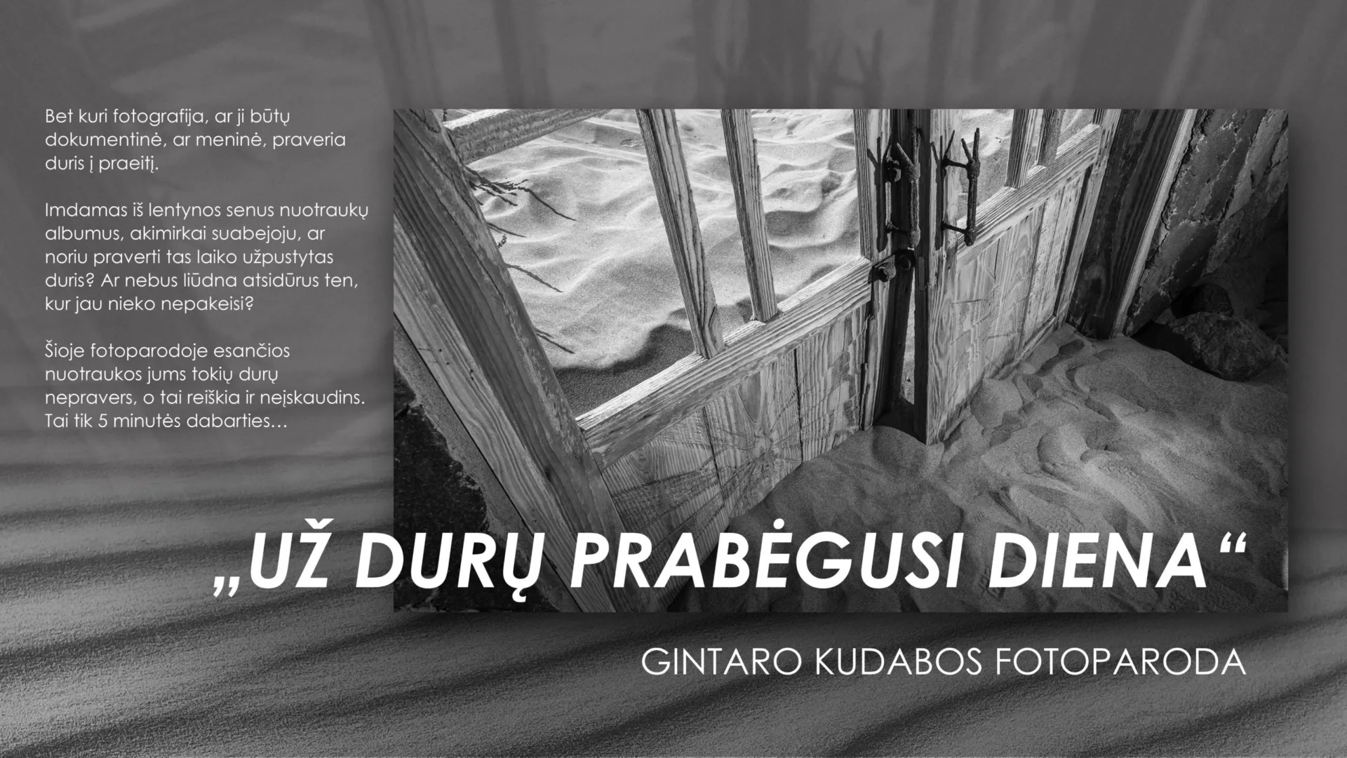 Šioje fotoparodoje esančios nuotraukos jums tokių durų nepravers, o tai reiškia ir neįskaudins. Tai tik 5 minutės dabarties….” – taip apie savo būsimą fotoparodą atsiliepia režisierius Gintaras Kudaba.