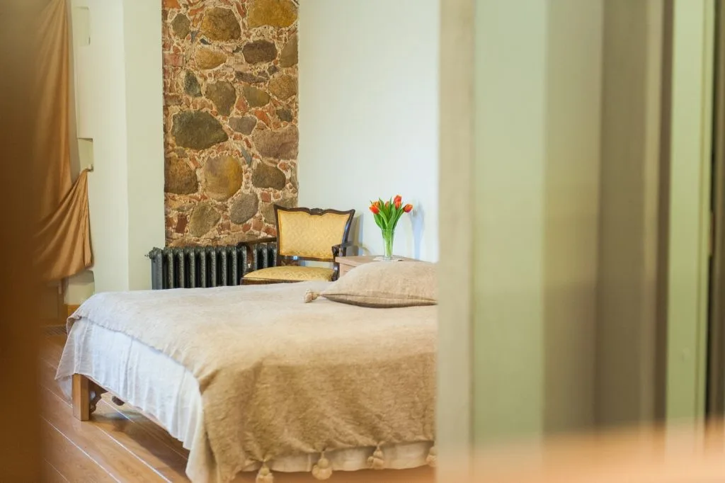 Pagrindinė atkurtų kambarių idėja – natūralumas, jis atsispindi senoviniuose restauruotuose kambarių balduose, tekstilėje – lininėje patalynėje, lietuviškuose vilnoniuose apklotuose, maloniose kambario detalėse: rankomis nertose ar siuvinėtose servetėlėse. Nors kambariai visuomet šilti, vėsesnėmis dienomis svečiams siūlome susikurti dar jaukesnes akimirkas prie malkomis kūrenamos krosnelės. Jos yra daugumoje kambarių.
