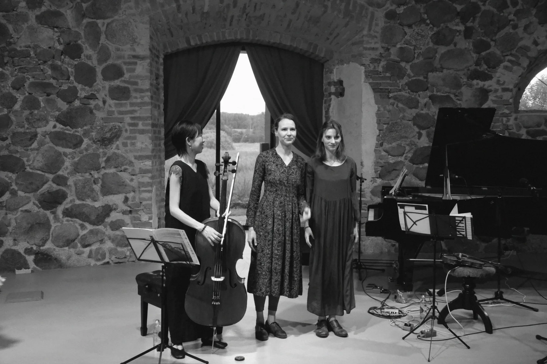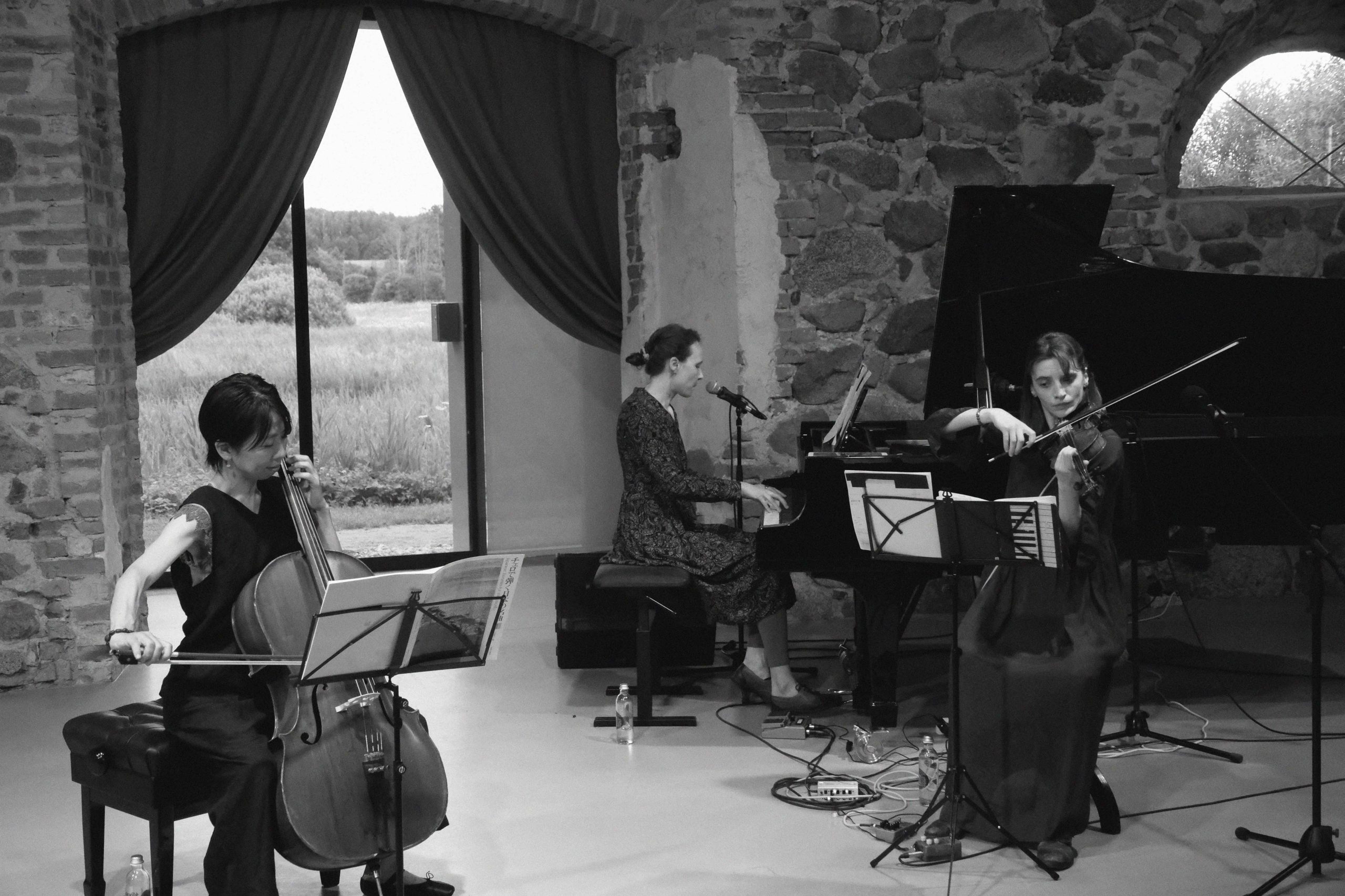 Keletas akimirkų iš tolimosios Tekančios Saulės šalies violončelininkės ir dainininkės Chie Narita bei pianistės, dainininkės ir kompozitorės Ievos Marijos Baranauskaitės bei smuikininkės ir dainininkės Lyjos Maknavičiūtės vasaros saulėgrįžos improvizacijos Paliesiaus dvare.