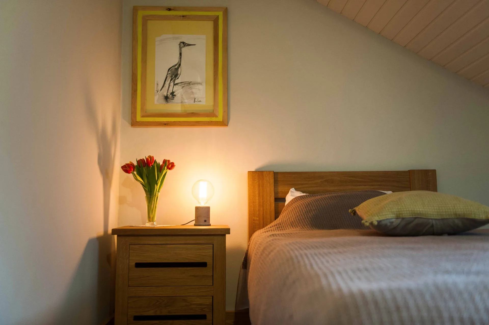 Vienvietis mansardinis kambarys antrame aukšte, tinkantis ir poilsiui, ir darbui.