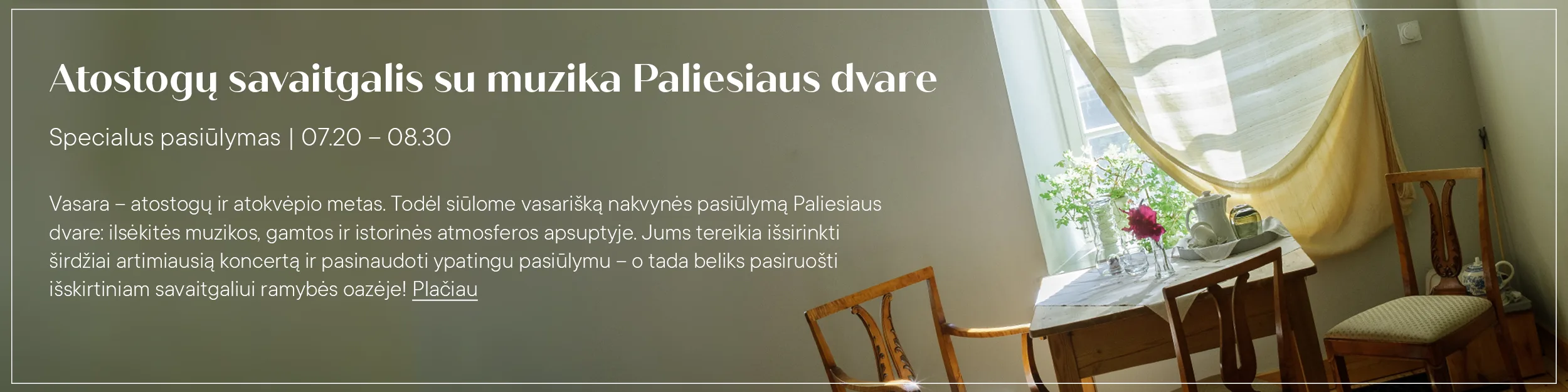 Vasara – atostogų ir atokvėpio metas. Todėl siūlome vasarišką nakvynės pasiūlymą Paliesiaus dvare: ilsėkitės muzikos, gamtos ir istorinės atmosferos apsuptyje. Jums tereikia išsirinkti širdžiai artimiausią koncertą ir pasinaudoti ypatingu pasiūlymu – o tada beliks pasiruošti išskirtiniam savaitgaliui ramybės oazėje!