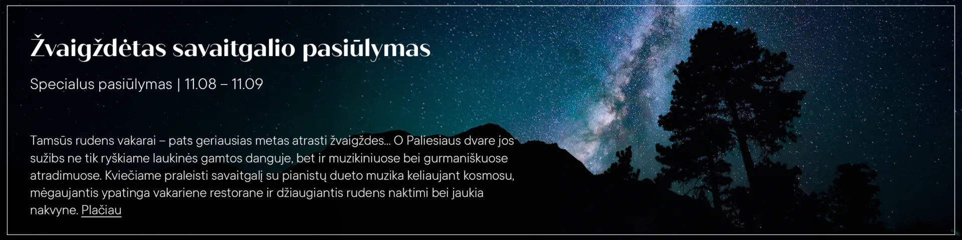 Tamsūs rudens vakarai – pats geriausias metas atrasti žvaigždes… O Paliesiaus dvare jos sužibs ne tik ryškiame laukinės gamtos danguje, bet ir muzikiniuose bei gurmaniškuose atradimuose. Kviečiame praleisti savaitgalį su pianistų dueto muzika keliaujant kosmosu, mėgaujantis ypatinga vakariene restorane ir džiaugiantis rudens naktimi bei jaukia nakvyne.
