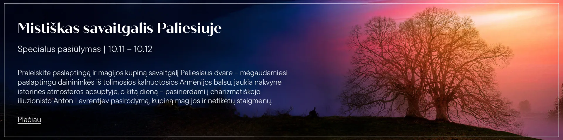Praleiskite paslaptingą ir magijos kupiną savaitgalį Paliesiaus dvare – mėgaudamiesi paslaptingu dainininkės iš tolimosios kalnuotosios Armėnijos balsu, jaukia nakvyne istorinės atmosferos apsuptyje, o kitą dieną – pasinerdami į charizmatiškojo iliuzionisto Anton Lavrentjev pasirodymą, kupiną magijos ir netikėtų staigmenų.