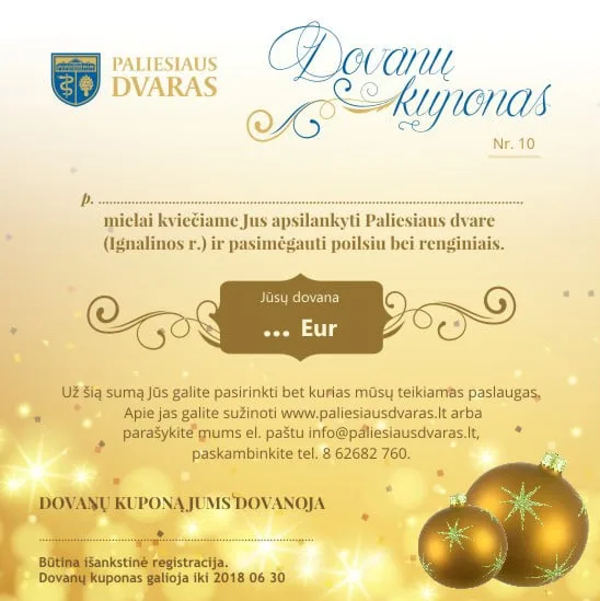 ŠVENTINIS DOVANŲ KUPONASDOVANOS Paliesiaus dvare – padovanokite Jums brangiems žmonėms DOVANŲ KUPONĄ, palikite malonumą rinktis – koncertą, gardžią romantišką vakarienę, viešnagę dvare su nakvyne… Ankstesnė naujiena Visos naujienos Kita naujiena