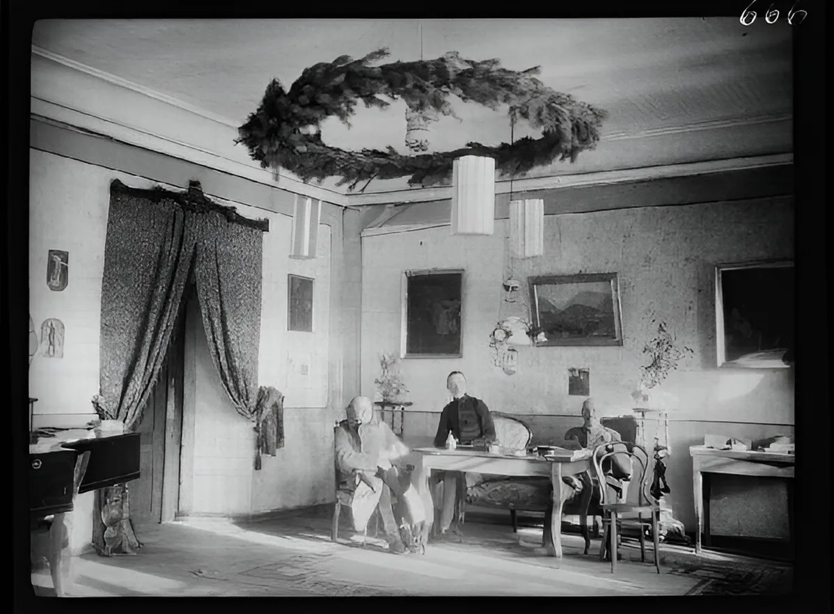 Ši archyvinė nuotrauka pasakoja apie dvaro kasdienybę šventiniu laikotarpiu. Eglišakių vainikas virš stalo – ženklas, primenantis senąsias tradicijas ir ramų švenčių laukimą.
